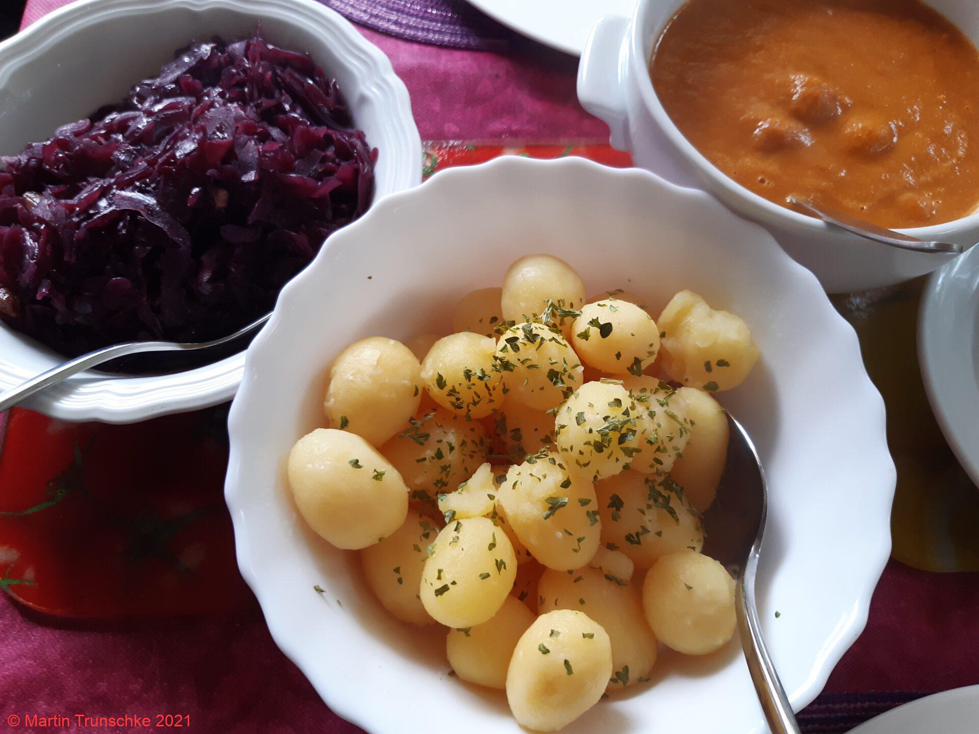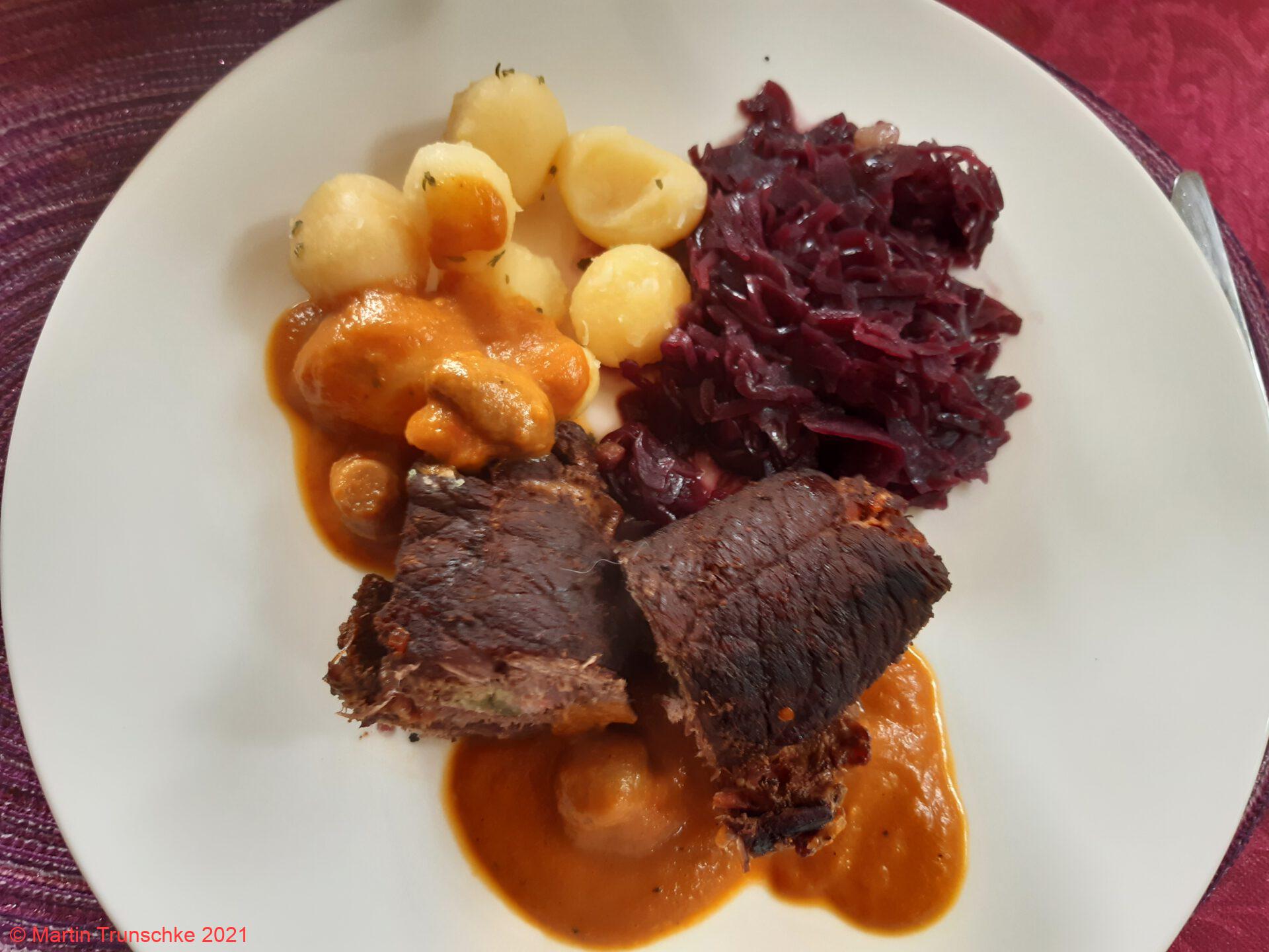 Rinderroulade, mit Apfelrotkohl und Salzkartoffeln