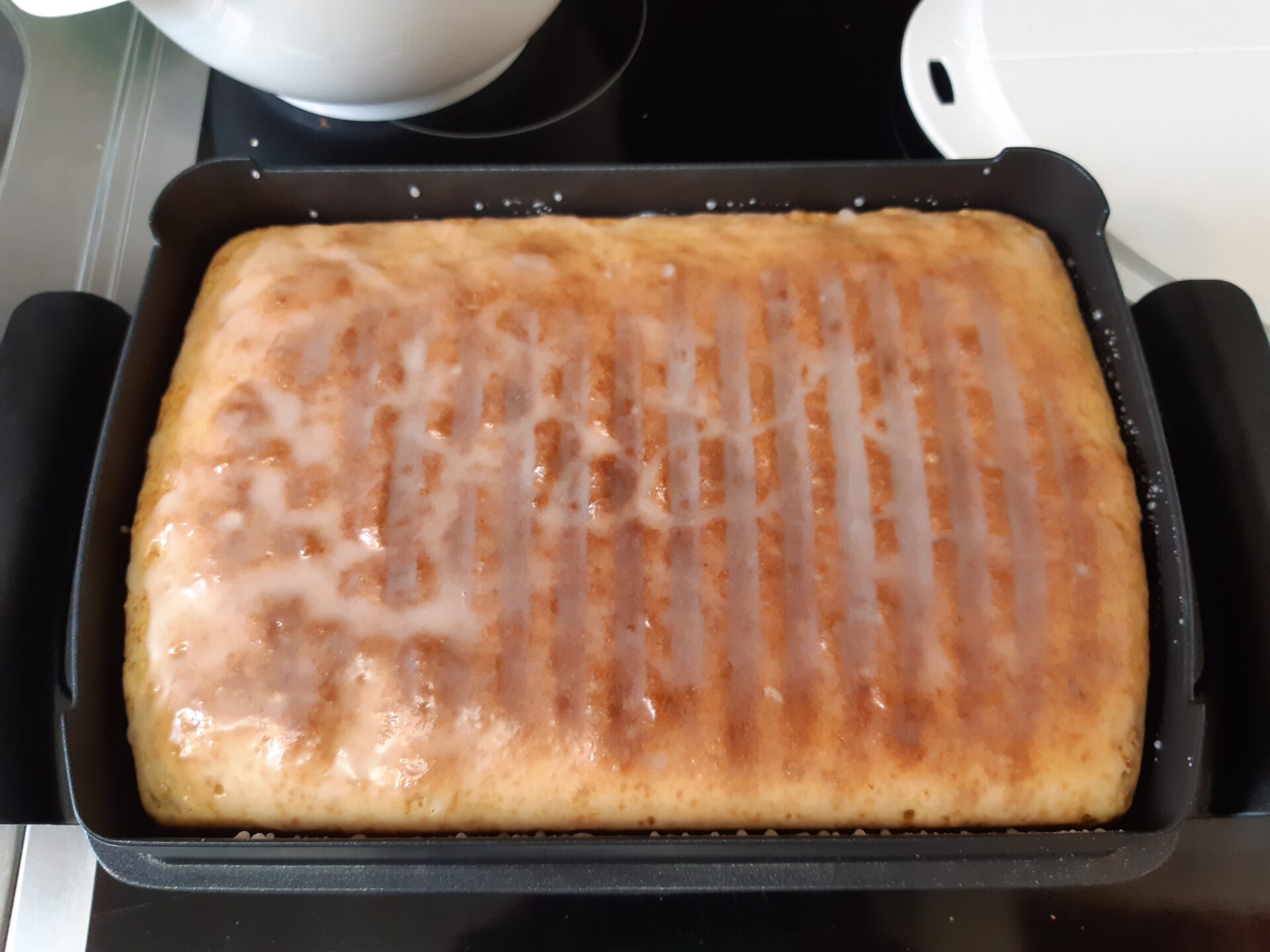 - Dann den Grill öffnen, Backschale entnehmen und den Kuchen 15 Minuten abkühlen lassen. In der Zeit den Zuckerguß anrühren. Wenn der Kuchen abgekühlt ist den Guß mit einem Pinsel über den Kuchen verteilen.