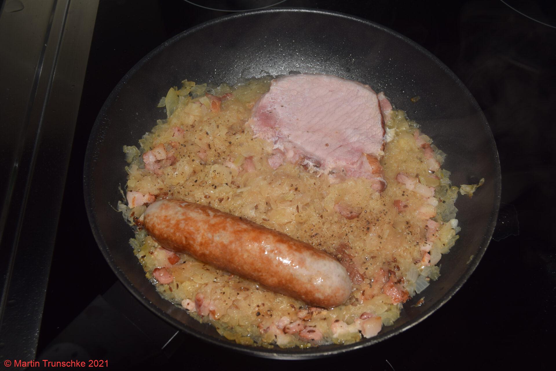 - Nun den Speck in der Pfanne auslassen und die Zwiebeln anbräunen. Das Sauerkraut dazu geben und umrühren. Etwas Sauerkrautwasser oder Apfelsaft dazu geben. Kümmel und Lorberblatt dazu geben, Kasseler und die Bratwurst auf das Sauerkraut legen und mit Deckel, bei mittlerer Hitze schmoren lassen. Ab und zu mal rühren. Bis die Kartoffeln gar sind.(ca.15 - 20 Minuten)