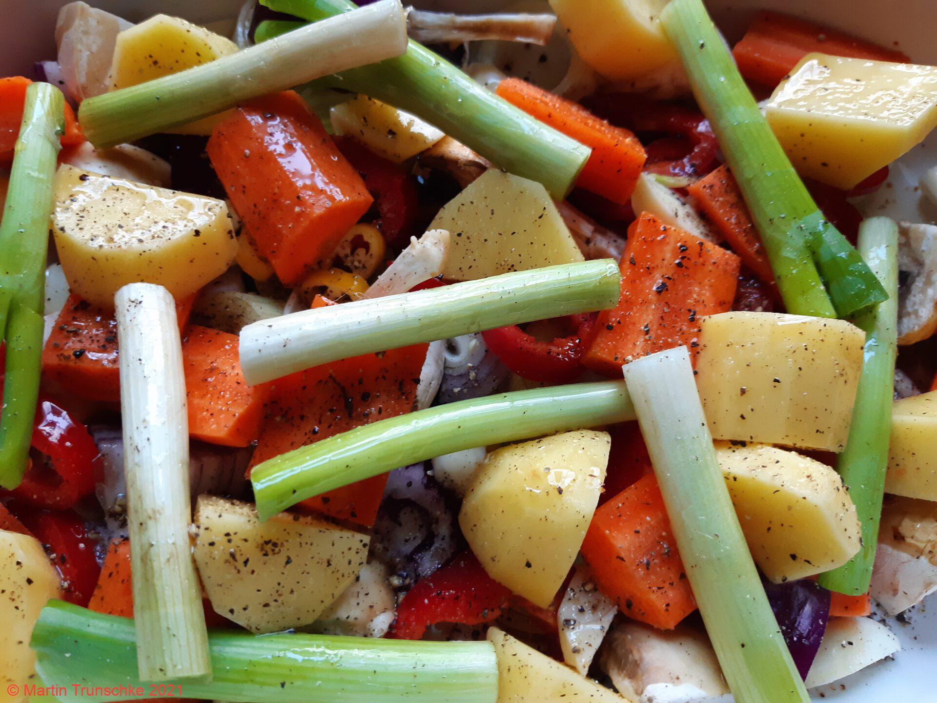 - Das Beilagengemüse in mundgerechte Stücke schneiden. Eine größere Auflaufform mit Sesamöl und Sojasoße einpinseln und das Gemüse einfüllen. Alles nochmal mit Öl und Soja beträufeln.