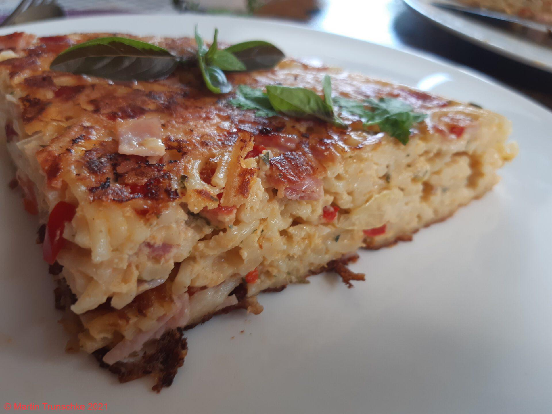 - Nudeln nach Anleitung kochen und abkühlen lassen. Zwiebel und den Knoblauch im Blender in feine Stücke hacken. Kochschinken, Tomaten und Spitzpaprika würfeln. Diese Zutaten alle in einer Schüssel vermischen. Die Eier in einer anderen Schüssel mit dem Paprikapulver und Pfeffer und Salz aufschlagen. Dann zur Nudelmische geben und noch einmal alles vermischen. Butterschmalz in einer große Pfanne heiß werden lassen und die Mische reinkippen. Gleichmäßig verteilen und leicht andrücken. Deckel auf die Pfanne und ca. 5-7 Minuten braten. Nun den Fladen umdrehen. Ich benutze dazu eine weitere große Pfanne (1x 30er und dann 1x 32er zum drehen). Weitere 5-7 Minuten abgedeckt braten. Nun einen großen Pizzateller aus das Omelette stülpen und wieder umdrehen. Pfanne weg, Teller mit Omelette auf den Tisch, wie eine Torte aufschneiden und die Soße dazu geben.