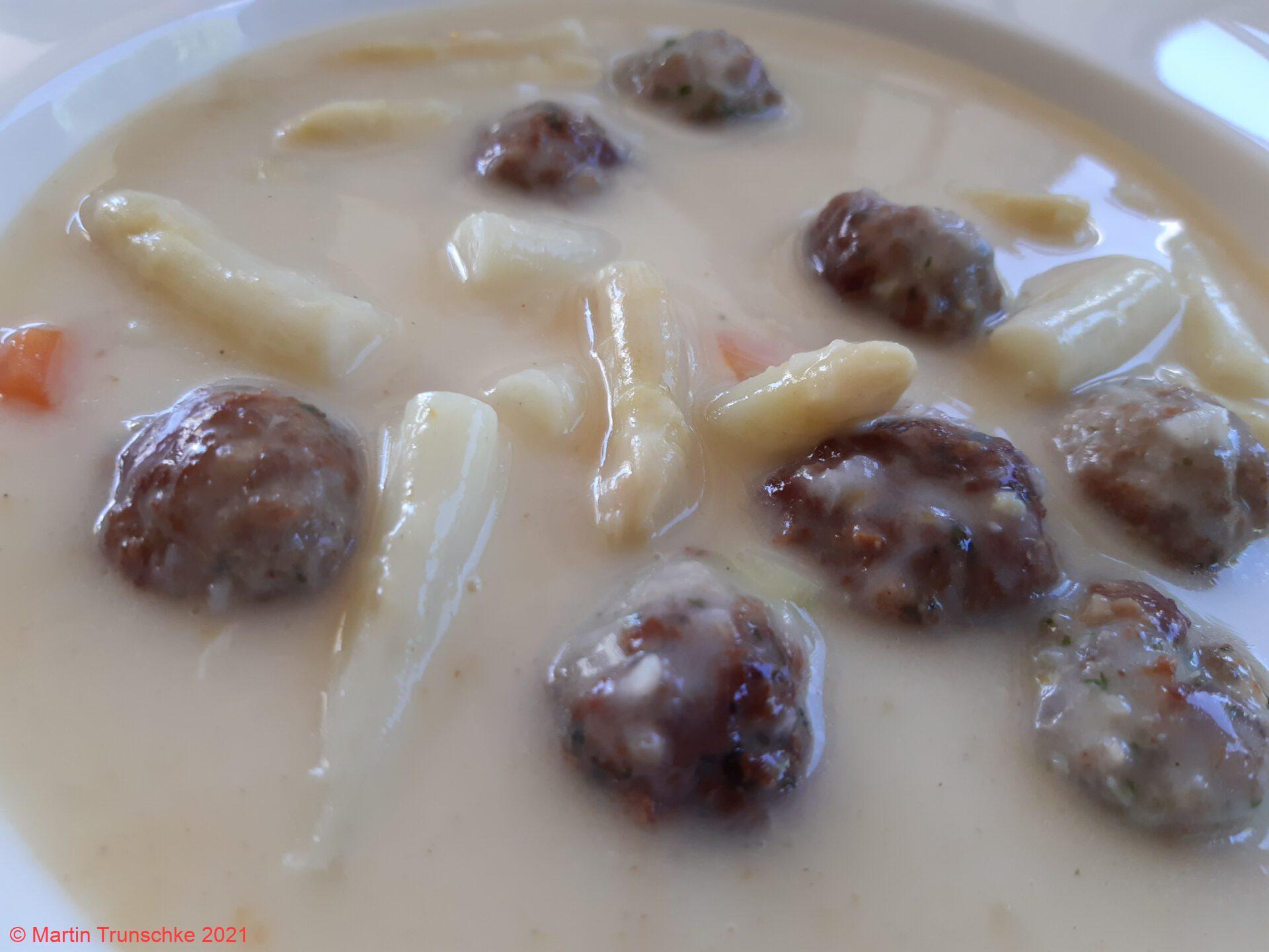 Spargelcremesuppe mit Bratwurstbällchen