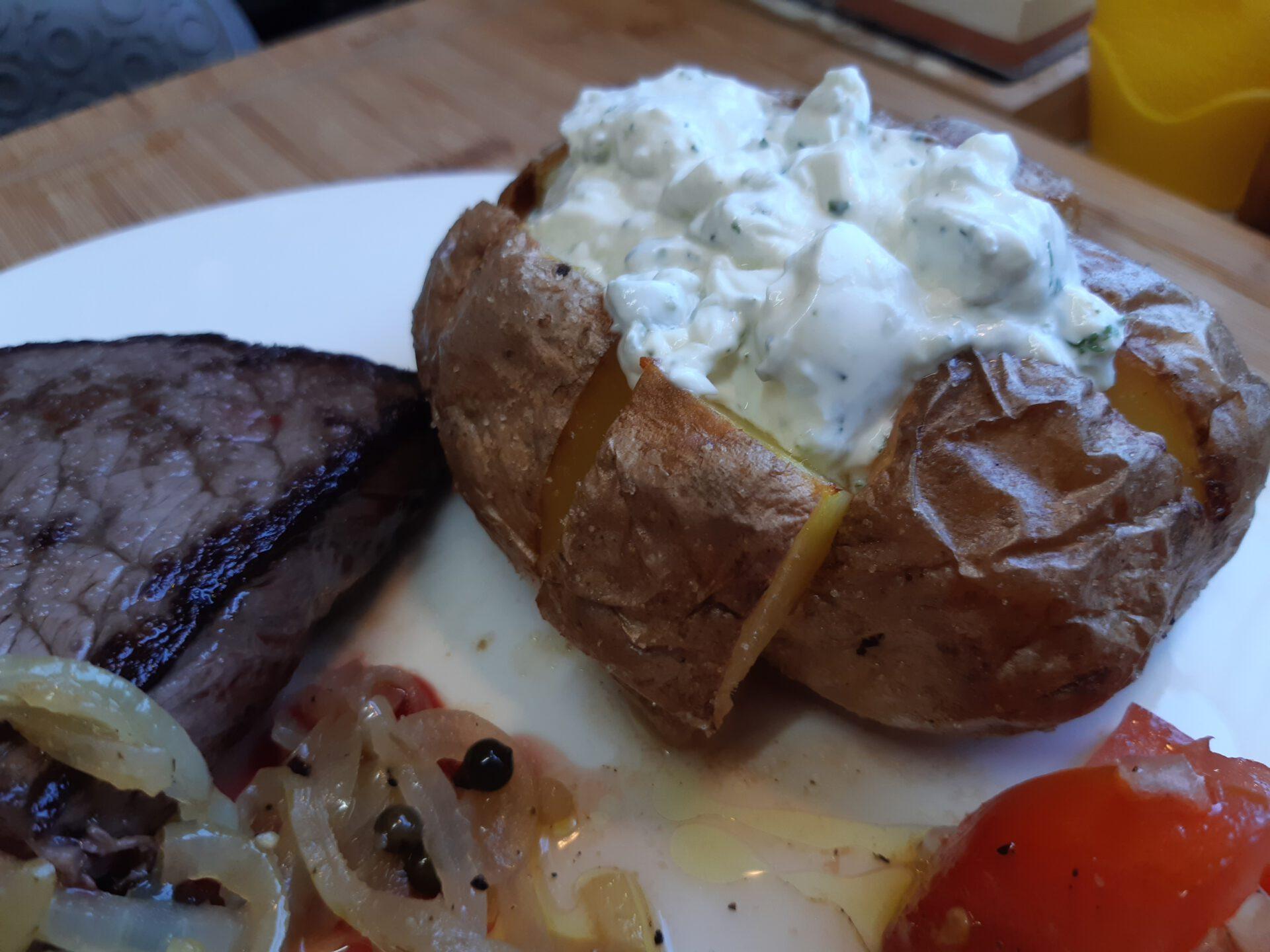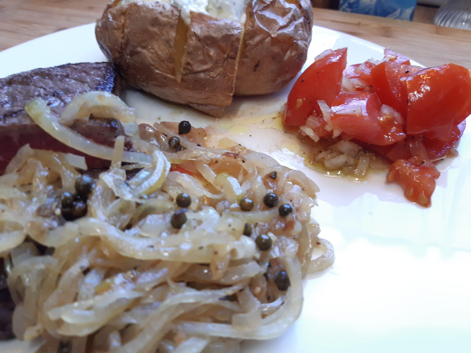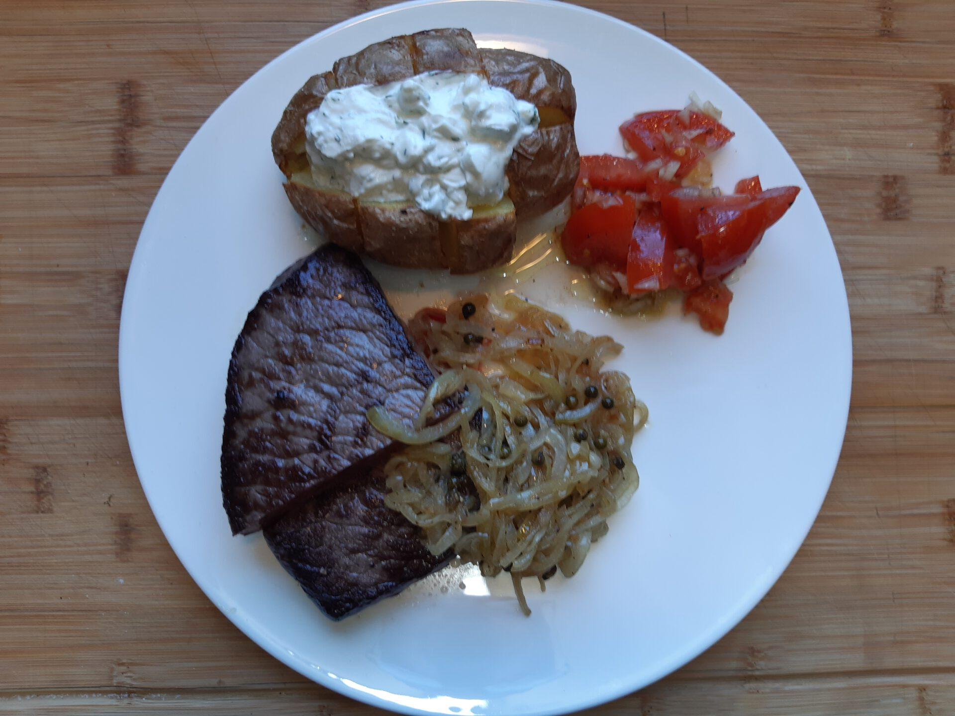 SteakOfenkartoffel mit Sourcream … Zwiebelsoße mit grünem Pfeffer … einfacher Tomatensalat |