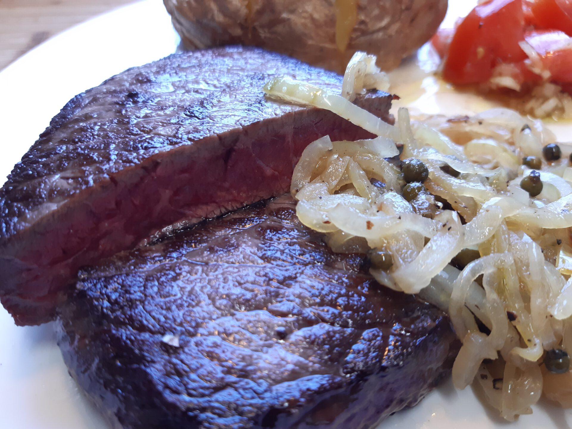 Steak … Ofenkartoffel mit Sourcream … Zwiebelsoße mit grünem Pfeffer
