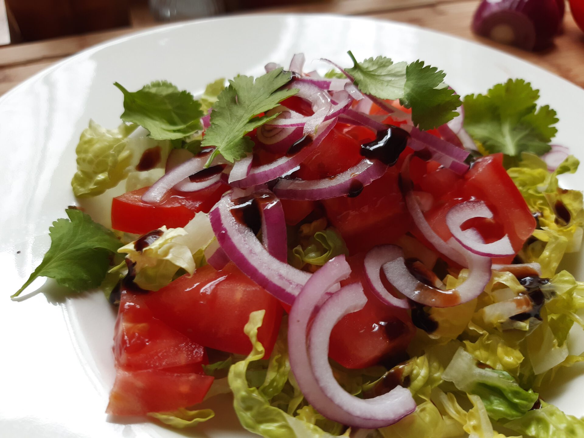 - Romanaherzen in Streifen schneiden, Tomate würfeln, Zwiebel in Ringe schneiden und auf einem Teller anrichten.