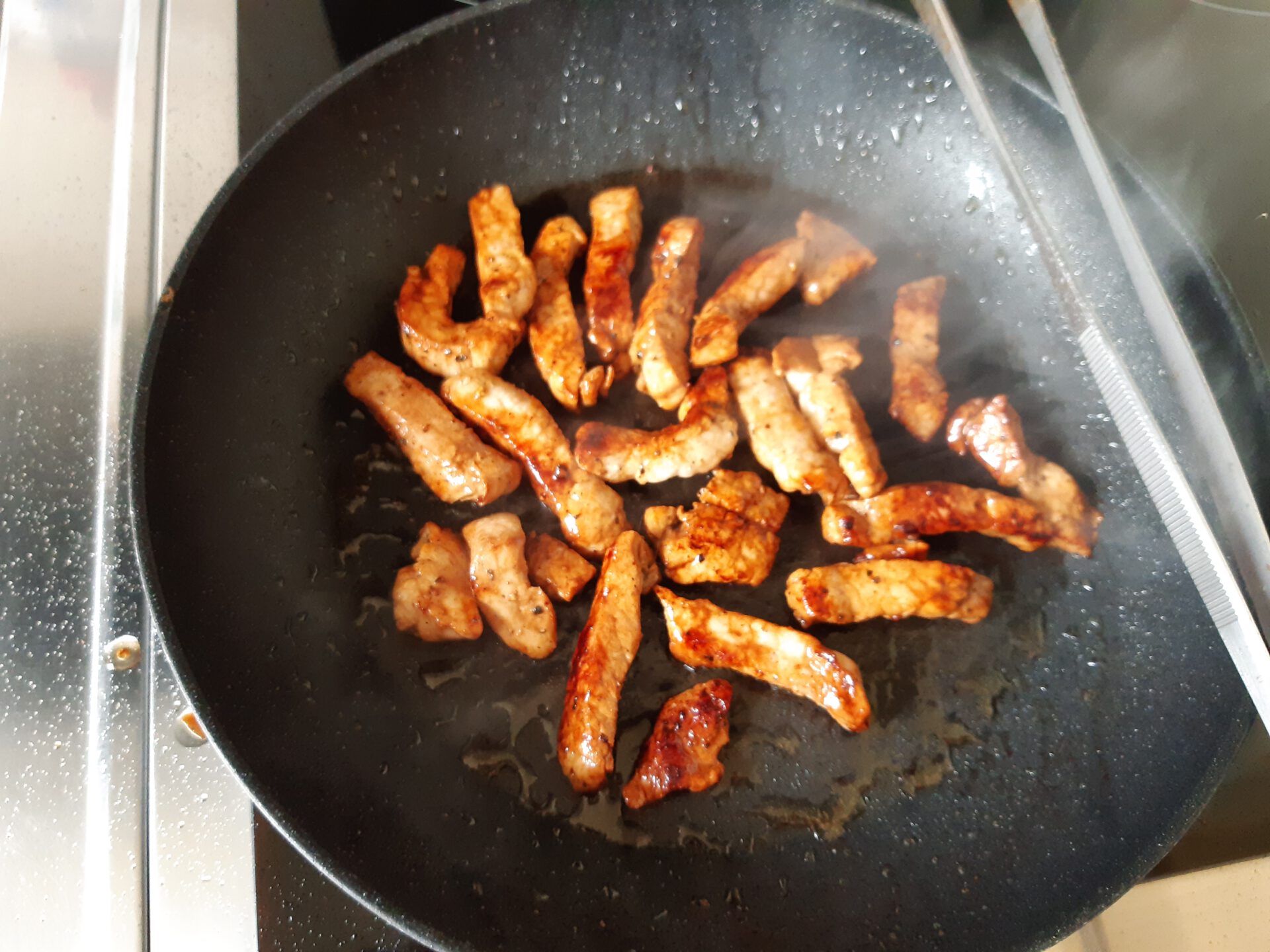 - Die marinierten Schnitzelstreifen scharf abbraten.