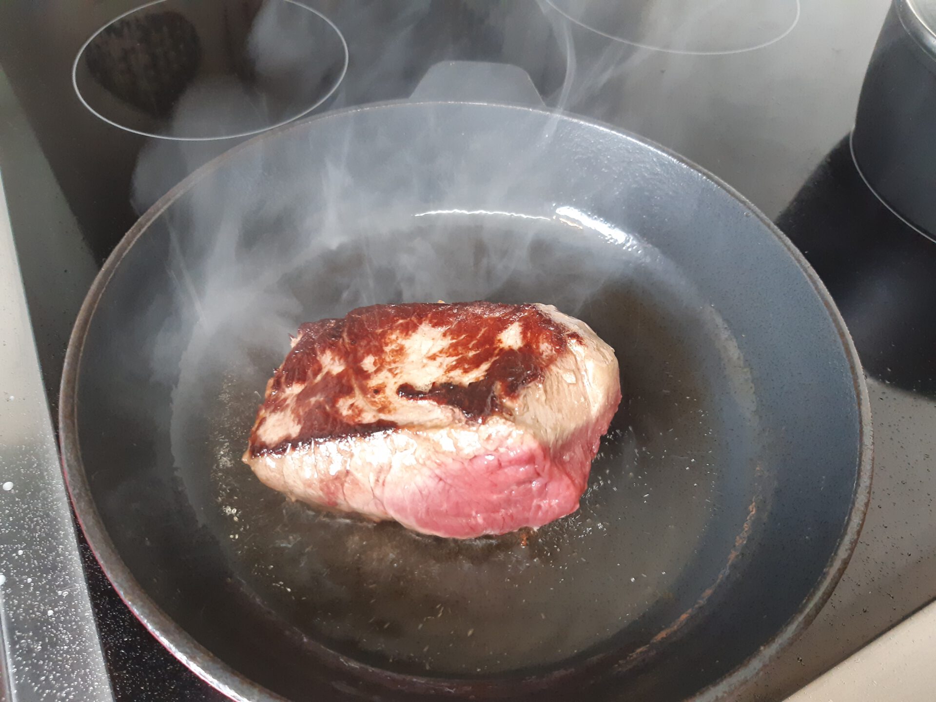 - Nun das Butterschmalz in der Pfanne wieder sehr stark erhitzen und das Steak von jeder Seite scharf anbraten (jeweils 2-2 1/2 Minuten). Dann auf ein Stück Alufolie legen und mit Pfeffer nach Geschmack würzen und mit der Folie einpacken. Jetzt das Pack in den auf 100°C vorgeheizten Backofen auf die mittlere Schiene legen (für 10-12 Minuten) Die Kartoffel auch dazu legen. In dieser Zeit die in Ringe geschnittene Zwiebel in dieselbe Pfanne geben und glasig braten (können ruhig etwas Farbe bekommen).