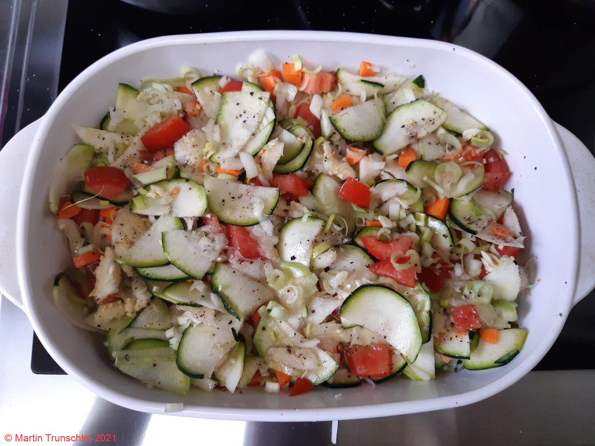 - Die Zucchini und Paprika Hälften mit der Mettmische füllen und auf das Gemüse legen und mit etwas TK Kräuter bestreuen. Dann mit je einer Scheibe Käse zudecken. Die Kasserolle für ca. eine Stunde in den auf 180°C vorgeheizten Backofen schieben. (mittlere Schiene)